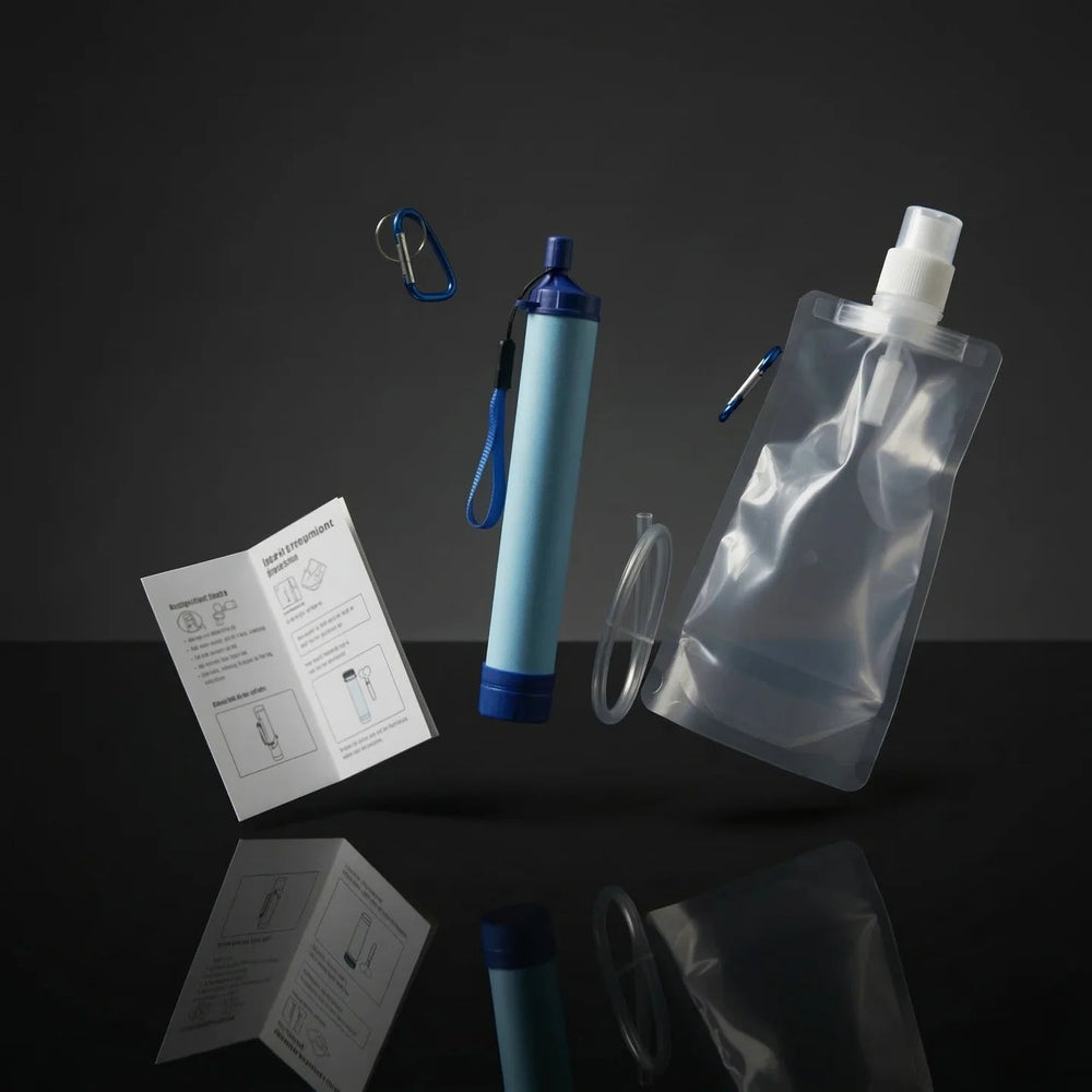 Collapsible water storage that packs flat and holds enough for emergency hydration. Simply screw it on and squeeze through water to filter.